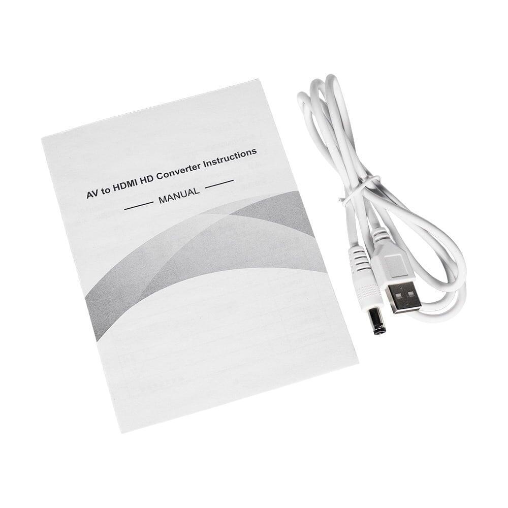 Конвертер відеосигналу AV на HDMI; вхід: AV (CVBS); вихід: HDMI; вхідний опір AV 75 Ом, вихідний опір HDMI 100 Ом; підтримка роздільної здатності до 1080P (50Hz/60Hz); живлення USB 5 В/350 мА (кабель у комплекті); робоча температура від -25°C до +75°C; розміри: 88 / 48.5 / 20 мм