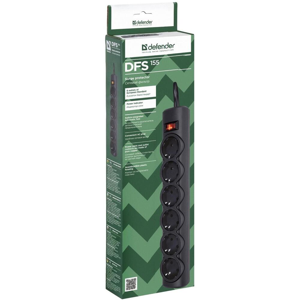 Power filtr 5,0м Defender DFS 155, чорний, 6 розеток, з вимикачем (994...