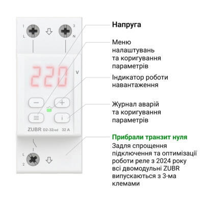 Оскільки сучасний щит вже включає нульову шину, то наявність транзиту нуля в пристрої перестала бути актуальною. З 2024 року всі двомодульні реле напруги будуть підключатися за допомогою трьох клем.