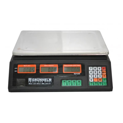 Ваги торгові GSC-051 Grunhelm Торгові ваги GSC-053 Grunhelm - зручна та практична модель з калькулятором та межею зважування 50 кг. Відмінний варіант для роботи в магазині, кафе, складах, ринковій торгівлі. Модель працює від мережі чи акумулятора. Ніжки регулюються. Корпус ваг виготовлений із пластику, платформа з нержавіючої сталі. Терезами зручно керувати за допомогою клавіш, вся інформація відображається на ЖК дисплеї. Є функції обнулення ваги, тарування, а також індикатор навантаження та низького заряду батареї.